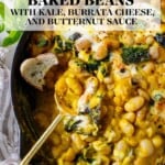 A fall-inspired recipe for baked beans with butternut sauce, kale, basil, and burrata cheese. A cozy vegetarian meal your whole family will love. Gluten-free.