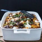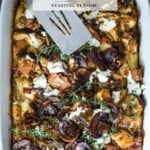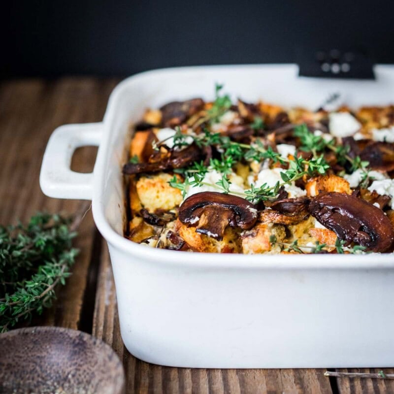 Baked Egg Casserole (called Breakfast Strata) with mushrooms, caramelized onions, goat cheese and thyme, perfect for the holidays. Make it ahead!