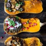 three roasted butternut squash halves stuffed with different savory fillings, like tofu and mushrooms, lentils and pomegranate seeds, and pecans and cauliflower, lying on wood surface.