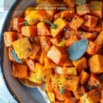 roasted butternut squash recipe with sage in a rustic serving dish.
