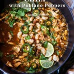 Cozy up with a bowl of White Bean Chicken Chili made with tender shredded chicken, poblano chilies, white beans, cilantro, coriander, and lime. Flavorful and hearty, this one-pot meal is nourishing and delicious! Serve it up with Skillet Cornbread and dinner is ready. Video.