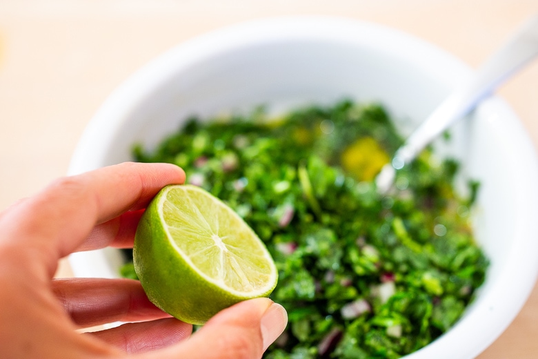 Step one: Finely chop the herbs ( leaves and stems), onion, garlic, and chili, and place them in a small bowl. (Or use a food processor – see notes.)