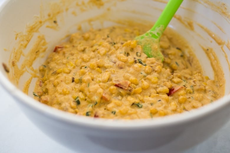 - Combine. Add the sauteed corn/pepper mixture to the dry ingredients along with the egg mixture and stir to combine all. Add 3/4 cup grated cheese. Pour the batter into a 2-quart greased baking dish, ( 8×9, 11 x 7) or you can bake it in a 10-inch cast ioron skillet) and top with the remaining 3/4 cup cheese. Batter should ideally not be over 2 inches high.