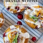 6. Make the glaze (optional). Add orange juice and powdered sugar to a small bowl or measuring cup and whisk until smooth. Drizzle over the cooled muffins and garnish with rosemary and orange zest.