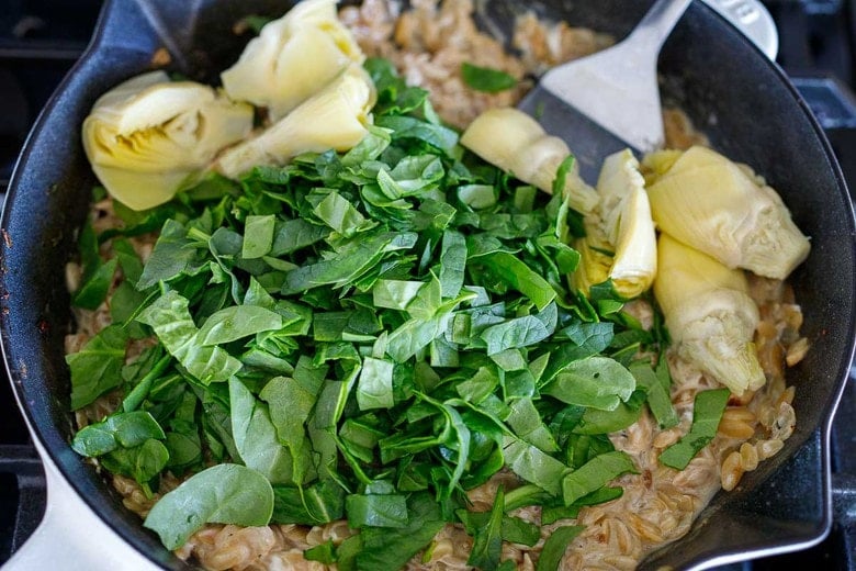 6. Stir in sour cream, spinach, and artichoke hearts. Give the pan a shake, it should level out nicely. If it’s too dry to level out, then add more chicken stock or water to loosen it up.