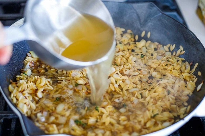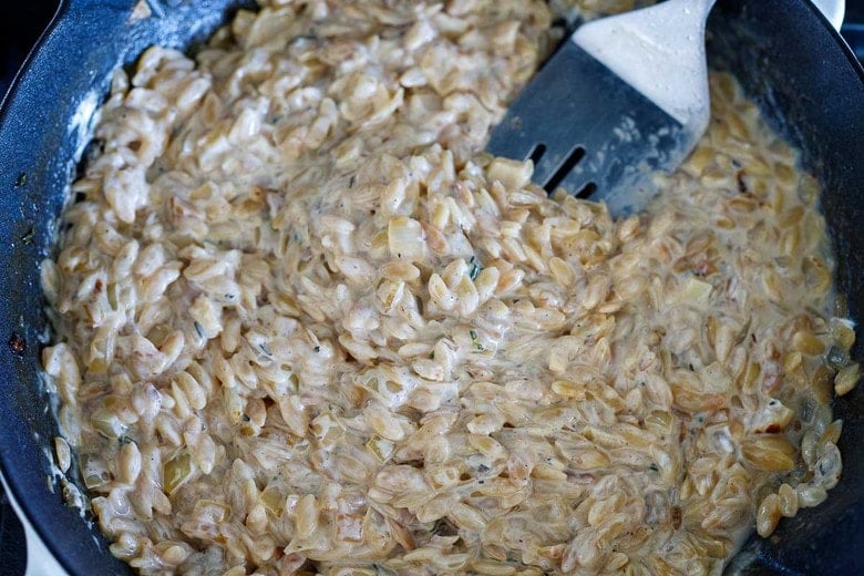 4. Saute: Lower heat to medium-low, and to the same skillet, add a tablespoon of olive oil,  onions, garlic and thyme. Saute 4-5 minutes until lightly golden and fragrant. Add the orzo, stirring 1-2 minutes. Add 2 cups of broth, scrape up any brown bits, stir in 1/4 teaspoon salt and mustard and bring to simmer, and cover for 4-5 minutes, or until orzo is al dente and has soaked up most of the liquid.