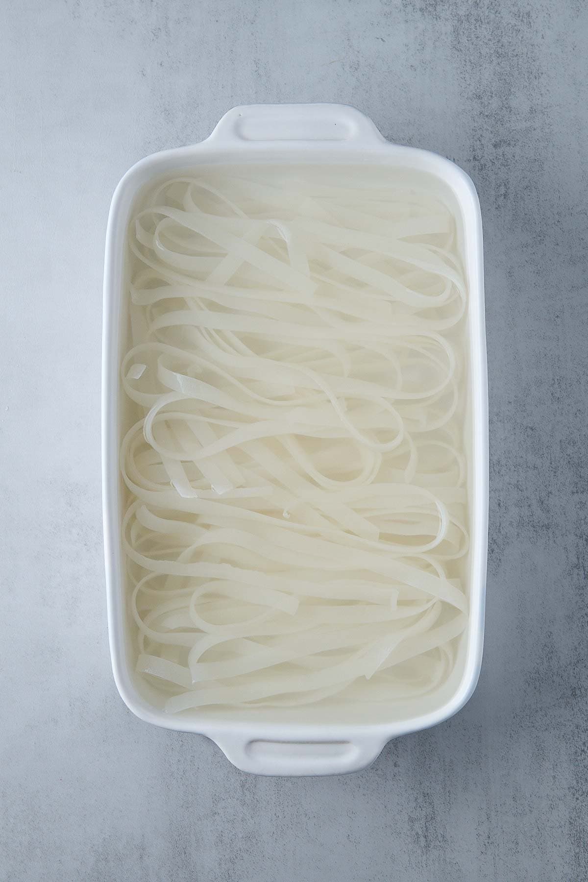 Step one. Prep the rice noodles. Soak rice noodles in hot boiling water until softened to al dente, 15-20 minutes depending on the size of your noodles.