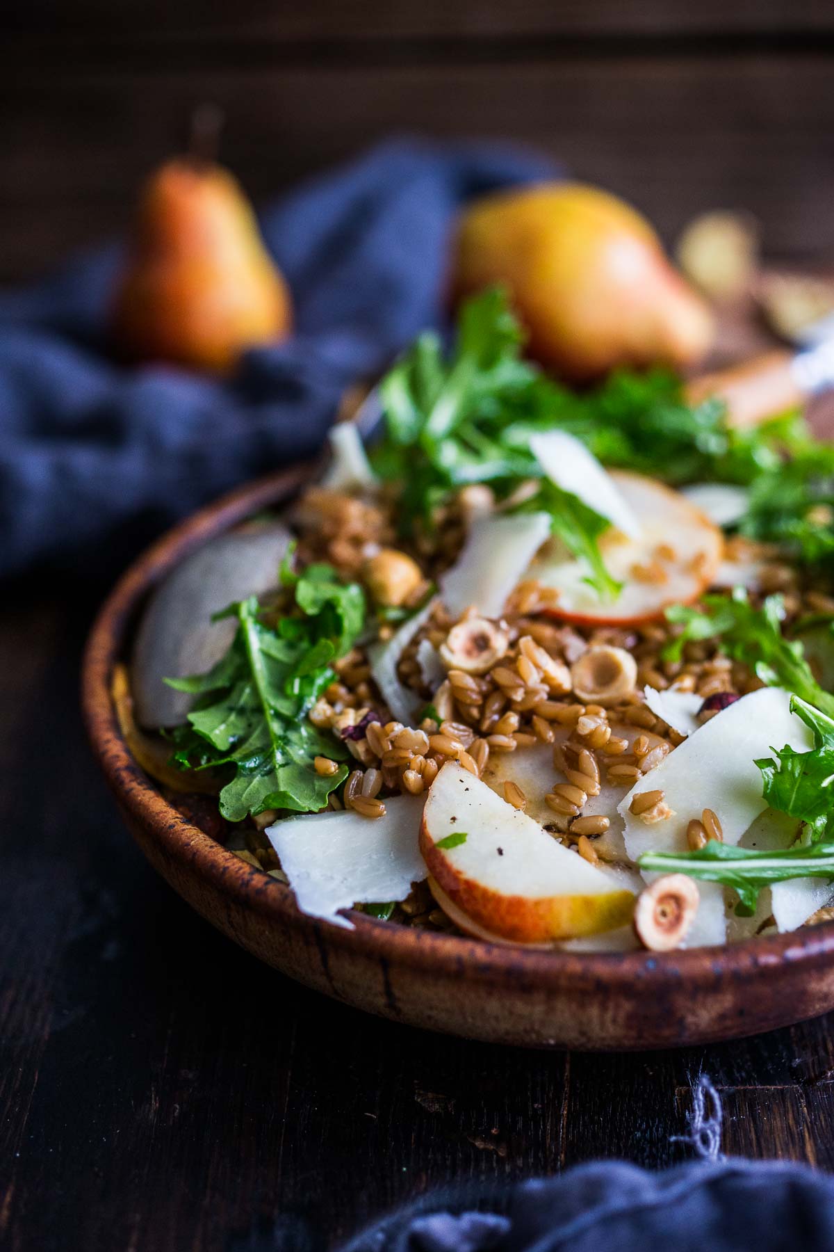 A delicious recipe for Farro Salad with pear, hazelnuts, and arugula. Keep it vegan or add pecorino. Either way, it’s a healthy, hearty fall salad!