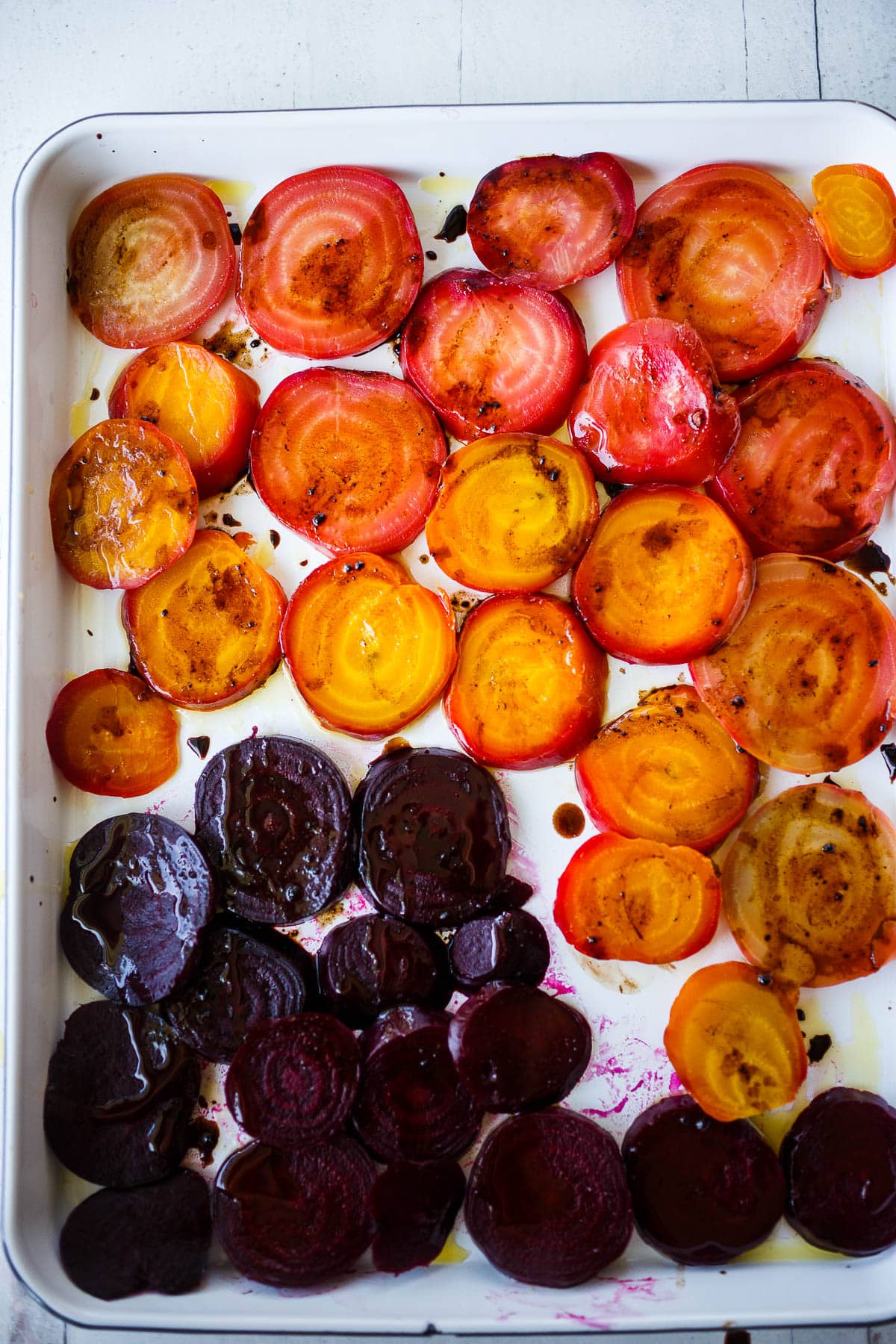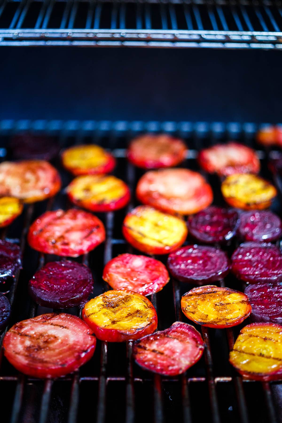 WHY bake the beets first? Not only does this process soften the beets, it caramelizes the beet in its own juices magnifying all the flavor within, resulting in an even sweeter, densely flavorful gorgeous delight. The grilling then takes it all to another level, creating a texture that is velvety with lightly caramelized edges.