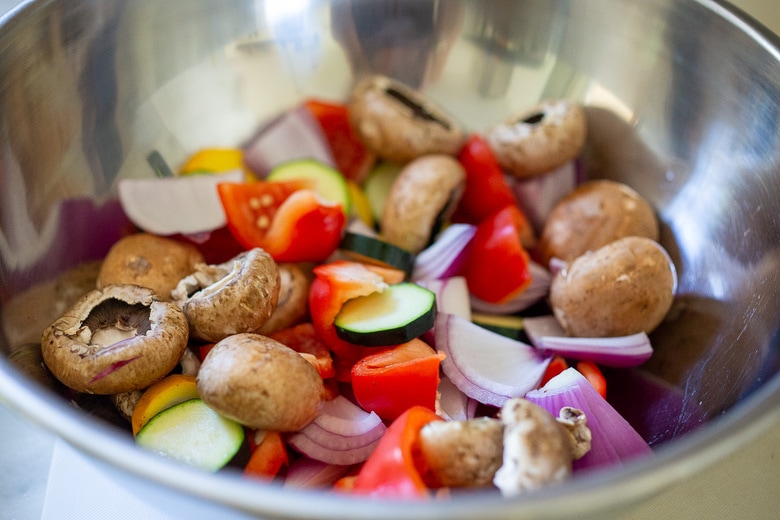 For fast, even cooking, cut veggies into thin equal thickness. Zucchini is best sliced as thin as the pepper is thick. Smaller button mushrooms are ok to leave whole. Onions can be cut into chunks, but separated so there are just two layers.
