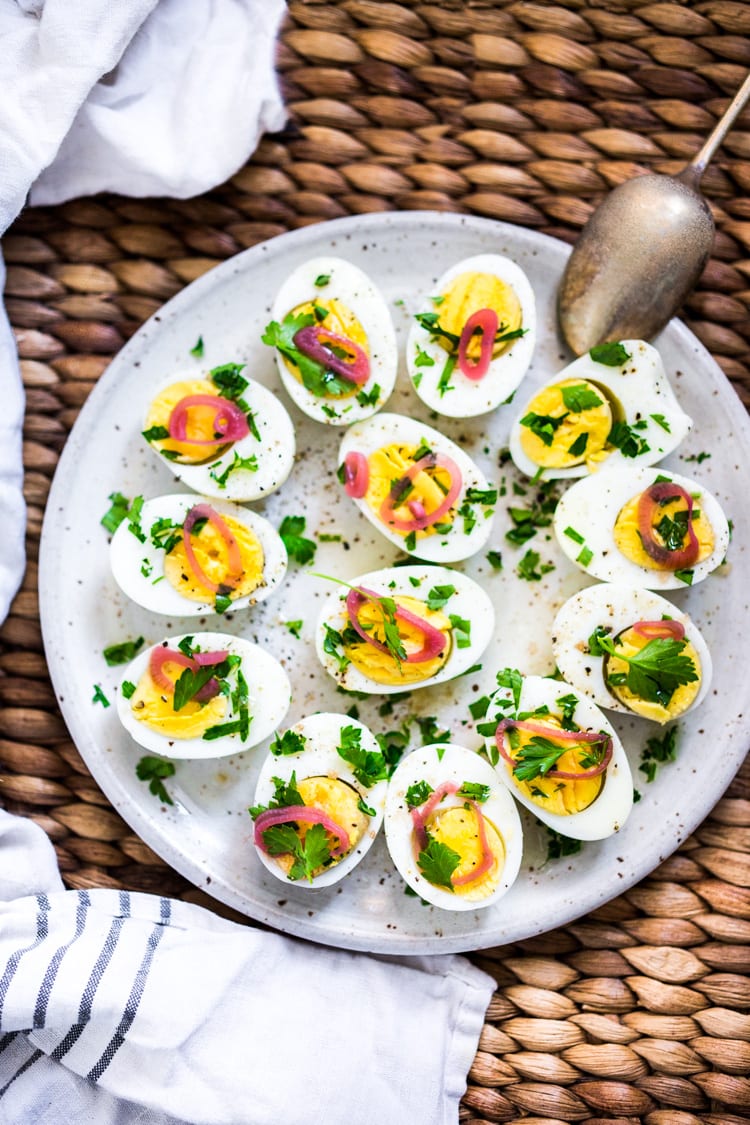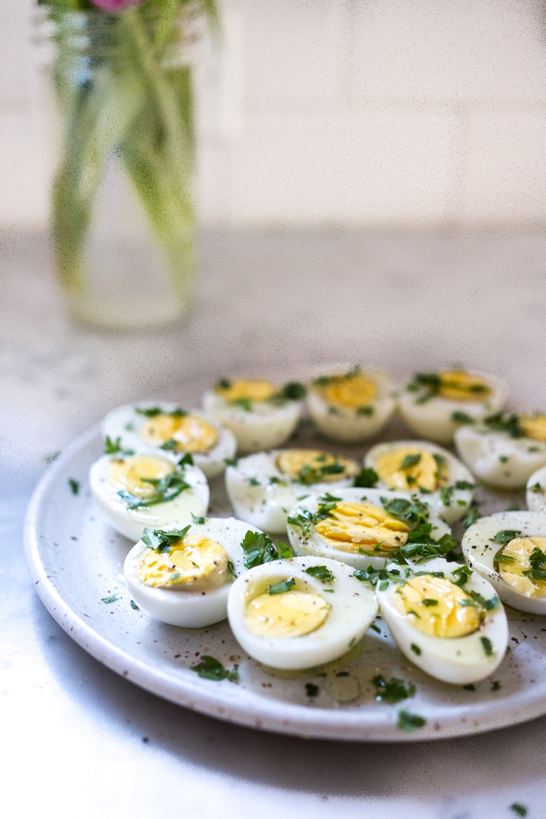 These simple hard-boiled eggs are sprinkled with salt and pepper, fresh herbs and pickled shallots, and drizzled with olive oil. An easy make-ahead brunch or appetizer recipe that is perfect for gatherings and potlucks. Think of these like deviled eggs but made in half the time!