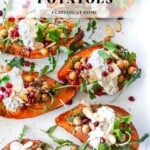 These baked Sweet Potatoes are topped with warm, Moroccan-spiced chickpeas, greens, and a zesty herbed yogurt sauce. Topped with toasted almonds and pomegranate seeds. A delicious healthy vegetarian dinner.