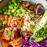 This Salmon Bowl is brimming with colorful veggies and savory Asian flavors. For optimal nutrition, serve over whole grains, like brown rice or quinoa. This is the ultimate macro bowl, full of healthy fats, fiber, and protein for sustained energy levels.