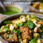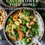 Savory oven-roasted Indian Cauliflower with Chickpeas and Caramelized Tofu, seasoned with a simple Madras Curry dressing. Serve it with fluffy basmati rice and cilantro mint chutney to create a hearty vegan bowl. A simple dish rich with fragrant spice and amazing flavors. Healthy, flavorful, and vegan!