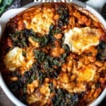 A simple recipe for Italian Baked Beans, with kale, cannellini beans, and your favorite homemade (or store-bought) Marinara sauce, baked in the oven until golden and bubbling. A delicious vegetarian main! Vegan adaptable and Gluten-free. Video