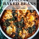 A simple recipe for Italian Baked Beans, with kale, cannellini beans, and your favorite homemade (or store-bought) Marinara sauce, baked in the oven until golden and bubbling. A delicious vegetarian main! Vegan adaptable and Gluten-free.