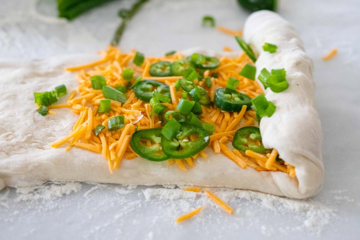 Treat the dough gently, flattening it lightly with your fingertips into a rough rectangle (10 x 16 inches) about 1 1/2 inches thick. It’s okay if it’s not perfect! Create the “S” swirl by placing half of the cheddar, jalapeƱos, and scallions on the right side of the rectangle.
