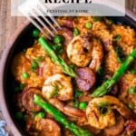 Instant pot Jambalaya in a bowl with asparagus, peas, shrimp, and chicken sausage.