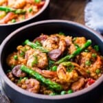 bowl of instant pot jambalaya with shrimp, chicken sausage, asparagus, peas, and green onions.