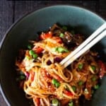 Kimchi noodles are a Korean-inspired stir-fry noodle dish packed with veggies (a great way to use up stray veggies in the fridge), tossed with a simple stir-fry sauce, and, of course, chopped-up kimchi. Garnish with green onions, optional peanuts, and viola; dinner is ready in under 30 minutes.
