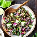 A 30-minute recipe for Thai Larb Salad, a fresh and flavorful Thai salad loaded up with crunchy cucumber, radishes and fresh herbs, tossed in a tangy lime dressing! Serve it with sticky rice, lettuce wraps, or both! Video. Vegetarian-adaptable.