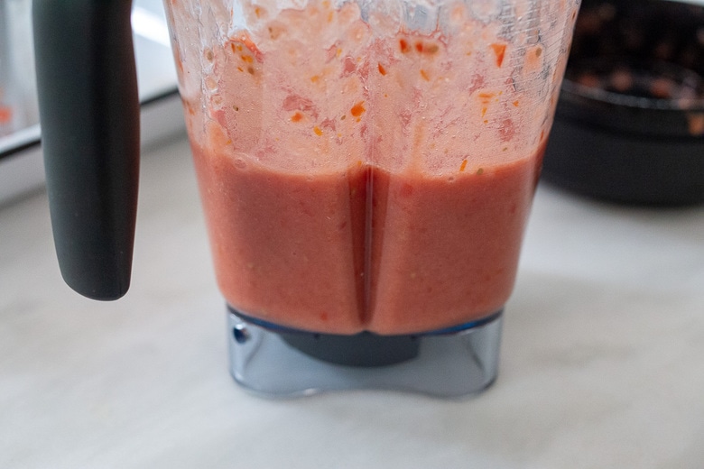 A fast and easy way to prep fresh tomatoes is simply to blend them up, skins and all. Yup, I know, this is not traditional but it is really time-saving – and I happen to like, even prefer the skins in here because they contain a higher concentration of healthy flavanols ( see #10).