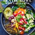 These grain-free Lentil Bowls are so easy, nourishing and delicious! Made with seasoned lentils, fresh seasonal veggies, dark leafy greens, fresh herbs or microgreens, nuts or seeds, avocado, and our favorite tahini sauce! Vegan, gluten-free and grain-free!