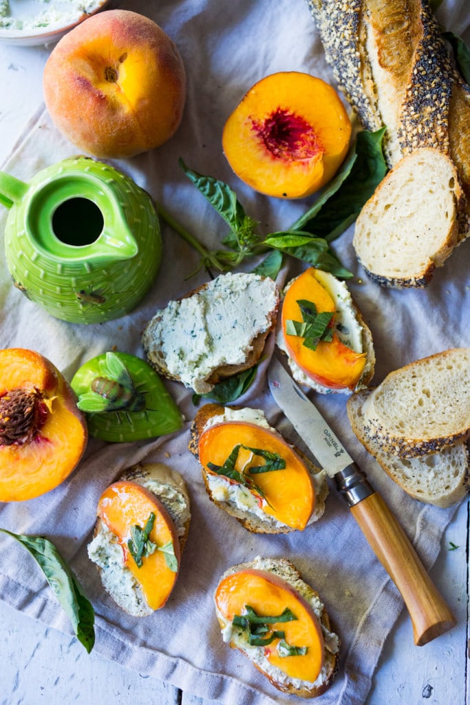 - Assemble: Spread a little goat cheese mixture on each bruschetta and top with a peach wedge. Garnish with a few basil ribbons, then drizzle with honey, and sprinkle with cracked pepper.