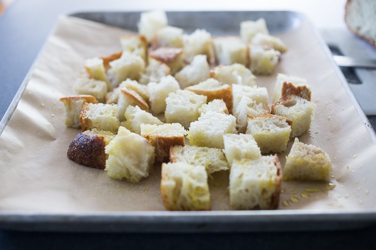 Step 1: Make the croutons! Lightly toss cubes of rustic bread in olive oil, sprinkle with salt and bake until crispy. No need for butter. I prefer baking croutons rather than to cooking them on the stove top for the convenience of  being a little more hands-free. Plus I think it requires less oil. While they are baking you can prep the other ingredients.