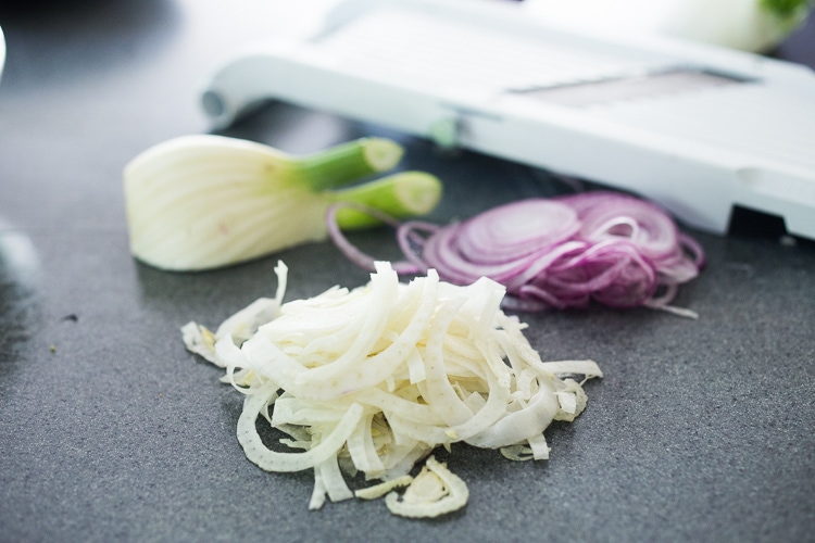 Cut the fennel and onion as thinly as possible, use a mandolin if you have one! Otherwise, a very sharp knife and a little patience will do fine, too.