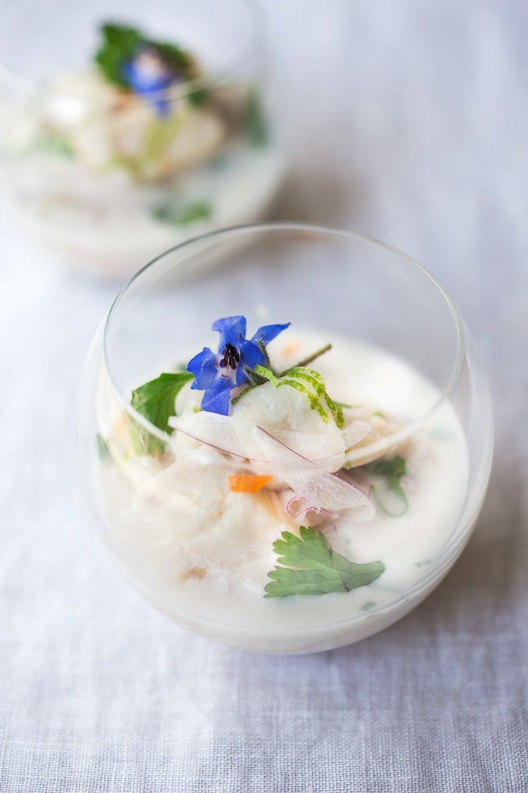 The first time I experienced real, authentic Peruvian ceviche, I thought I died and gone to heaven. I’m a ceviche lover and it really hit all the right notes for me. Here in the States, it’s hard to find the signature chili (Ajo Limo pepper) to perfectly recreate this, but I came up with a way to mimic the flavor. We use this recipe in our catering business, and it never fails to impress!