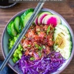 You can simply just make the poke salad itself (with either ahi or tofu) or create the whole Bowl, loaded up with veggies, rice and the Poke Bowl Sauce.