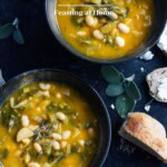Pumpkin Soup with leeks, white beans and sage. Vegan-adaptable, flavorful, and EASY. Nourishing for body and soul, this healthy fall harvest soup is fast to make and delicious! Comforting on chilly days and hearty enough for the main entree.
