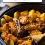 Cut potatoes smaller than squash, because they take a little longer to cook. Use peeled russets, or a non-waxy potato-like yukon ( a “drier” potato) for the best texture. With thin-skinned potatoes, you won’t need to peel. Waxy potatoes like red, or small whites, don’t allow the flavor to soak in quite as much and take a bit longer to cook.
