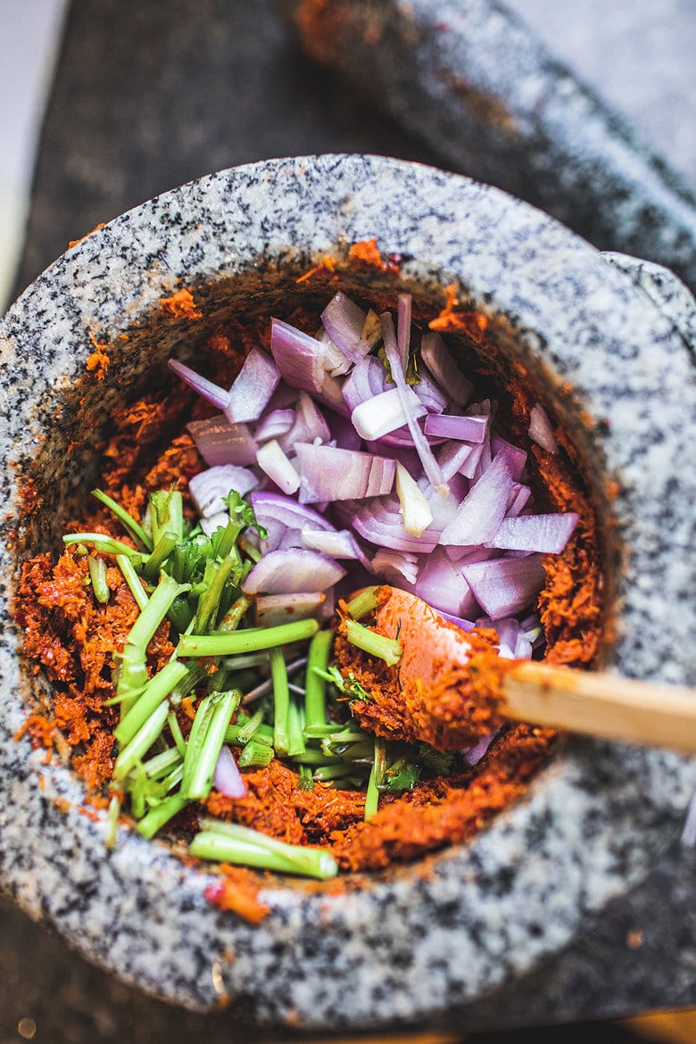 - After pounding the chilis and salt together first, pound the fibrous ingredients first before adding the softer ones. Check out the steps below for how I would pound my chili paste in order of ingredients.
