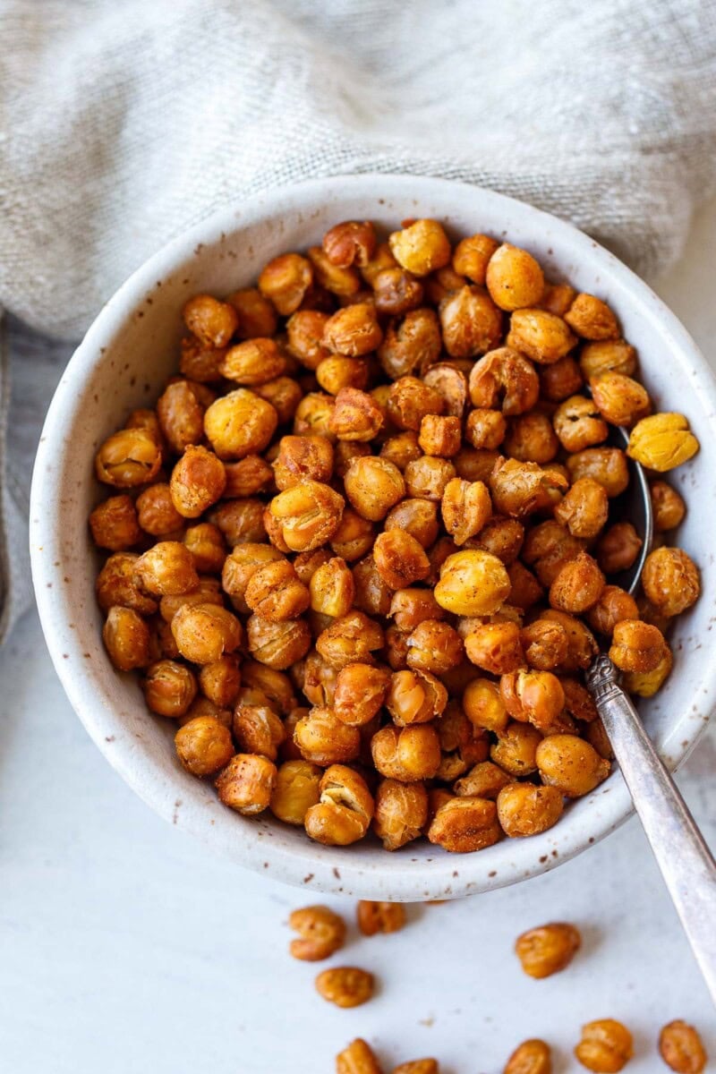 We feature chickpeas a lot on the blog – they are so versatile in the kitchen, providing healthy fiber, nutrients (copper!), and protein. After we batchmake chickpeas from scratch (see our guide on how to cook dry chickpeas) I like to set some aside for this roasted version- it is one of the easiest ways to enjoy them-made with just three ingredients and endlessly customizable with your favorite seasonings.