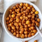 Here is one of my favorite chickpea recipes! As a chef, I’m always looking for new, fun ways to turn simple ingredients into something my whole family will crave. These roasted chickpeas have become a favorite snack around here. Not only are they cleaner and healthier than packaged versions, but they’re also naturally vegan and gluten-free.