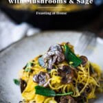 Roasted Spaghetti Squash with mushrooms, garlic and sage- a flavorful and healthy low-carb meal that feels like a comforting pasta dish! Perfect for fall! Keep it vegan or add grated Romano cheese!