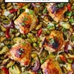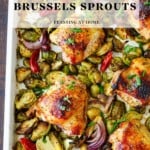 Chicken: You can use skinless boneless thighs, or even chicken breast but cooking times will shorten. Check after 15- 20 minutes, and if the chicken is done but the brussels sprouts need longer, just remove the chicken, letting the brussels sprouts cook until tender, probably the whole 30 mins.
