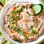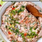 This smoked salmon dip is rich, creamy, and full of briny, zesty flavor! Made with extra smoked salmon, plenty of fresh dill, tangy yogurt, cream cheese, green onion, lemon zest, and capers, it strikes the perfect balance of flavors.