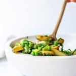 - In medium pot, blanch potatoes 20 min or until fork-tender, in salted water. ( I use enough water to cover potatoes by 1 inch, and add a hearty 1 T of salt) When the potatoes are tender add the fresh peas to the pot and blanch 1-2 minutes, until vibrant green and floating. Drain and rinse with cold water.