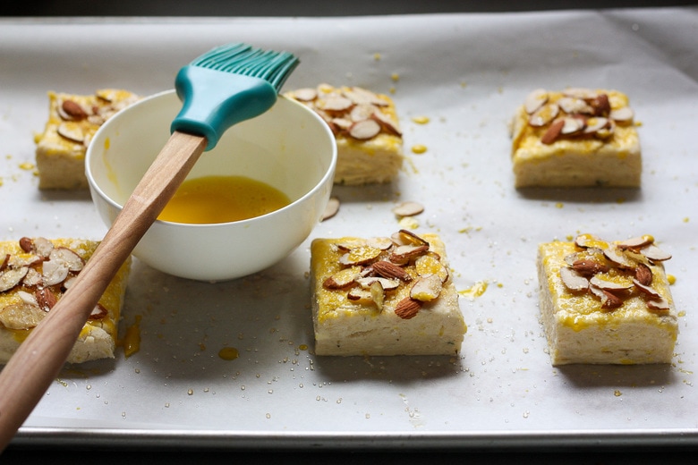 - Shape into a square with your hands, about 6 x 6 and about 1/2 inch thick. Â Cut into 6 pieces. Â Place biscuits on parchment lined baking sheet. Â Brush with egg wash (see notes) sprinkle with sliced almonds and sugar.