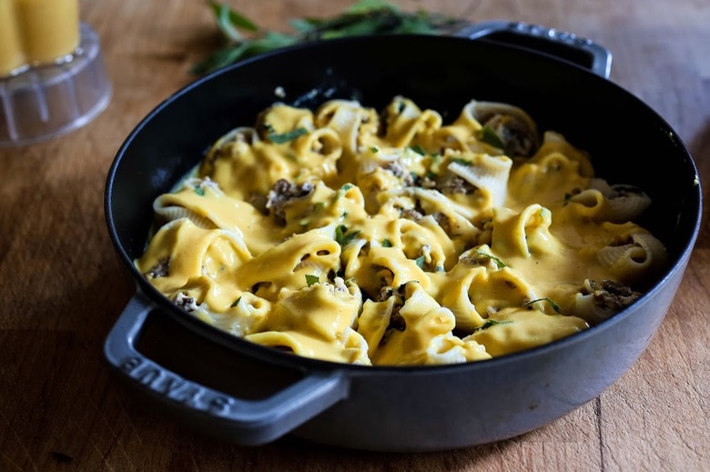Delicious! I loved how easy and flavorful the sauce was. I used the flesh of a roasted heirloom pumpkin which gave the sauce a vibrant orange color. I used both sausage and mushrooms in the filling. The added texture and flavor of the pine nuts in the filling were nice. It was a rich, comforting and delicious dish.