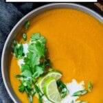bowl of sweet potato soup with coconut milk, cilantro, green onions, and lime.