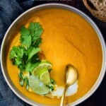 Serve this Sweet Potato Soup with a swirl of coconut milk, cilantro, scallions, lime wedges, and Aleppo chili flakes.
