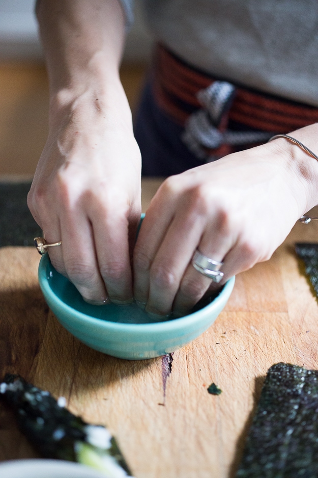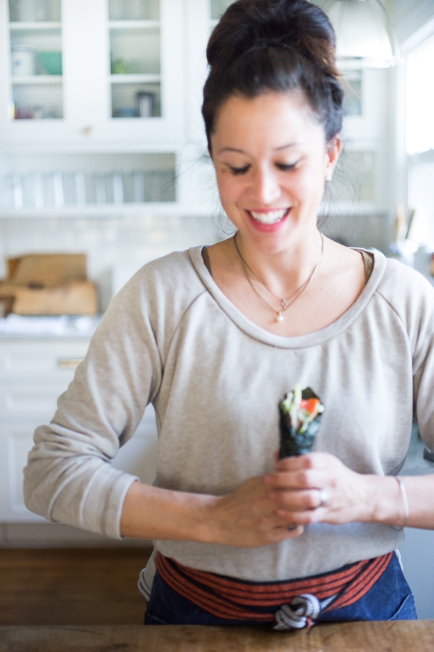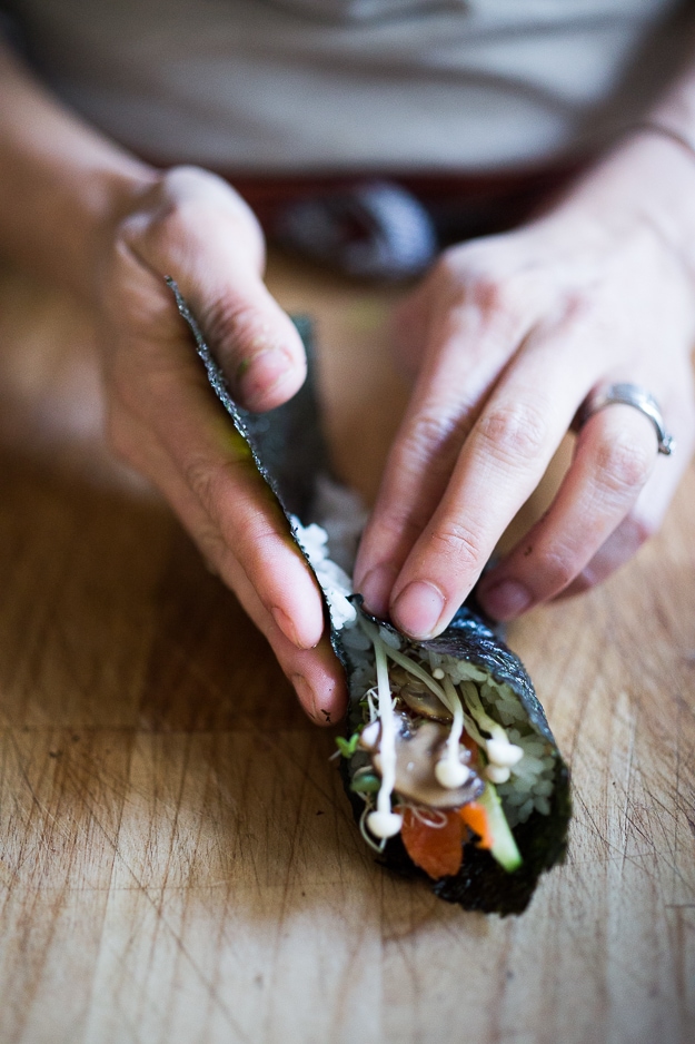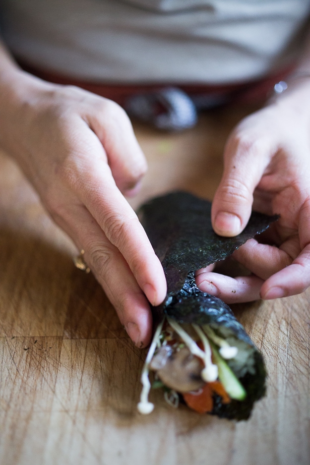 Create a cone-shaped roll and seal with a little water. Place seam side down. And there you have it! A beautiful temaki hand roll that is not only delicious- but so healthy and light.