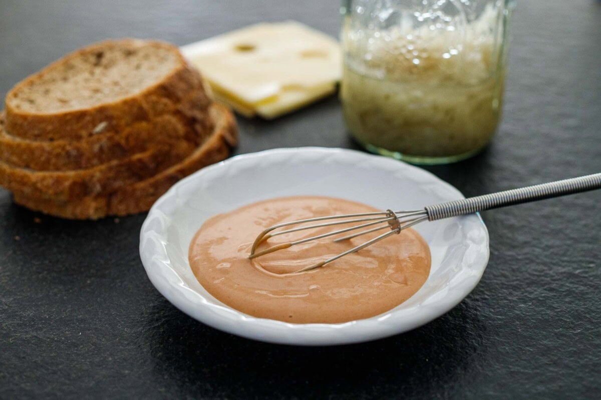 Step 5: Make the quick Reuben sauce. Simply whisk ingredeints together in a bowl. Or just use mustard!