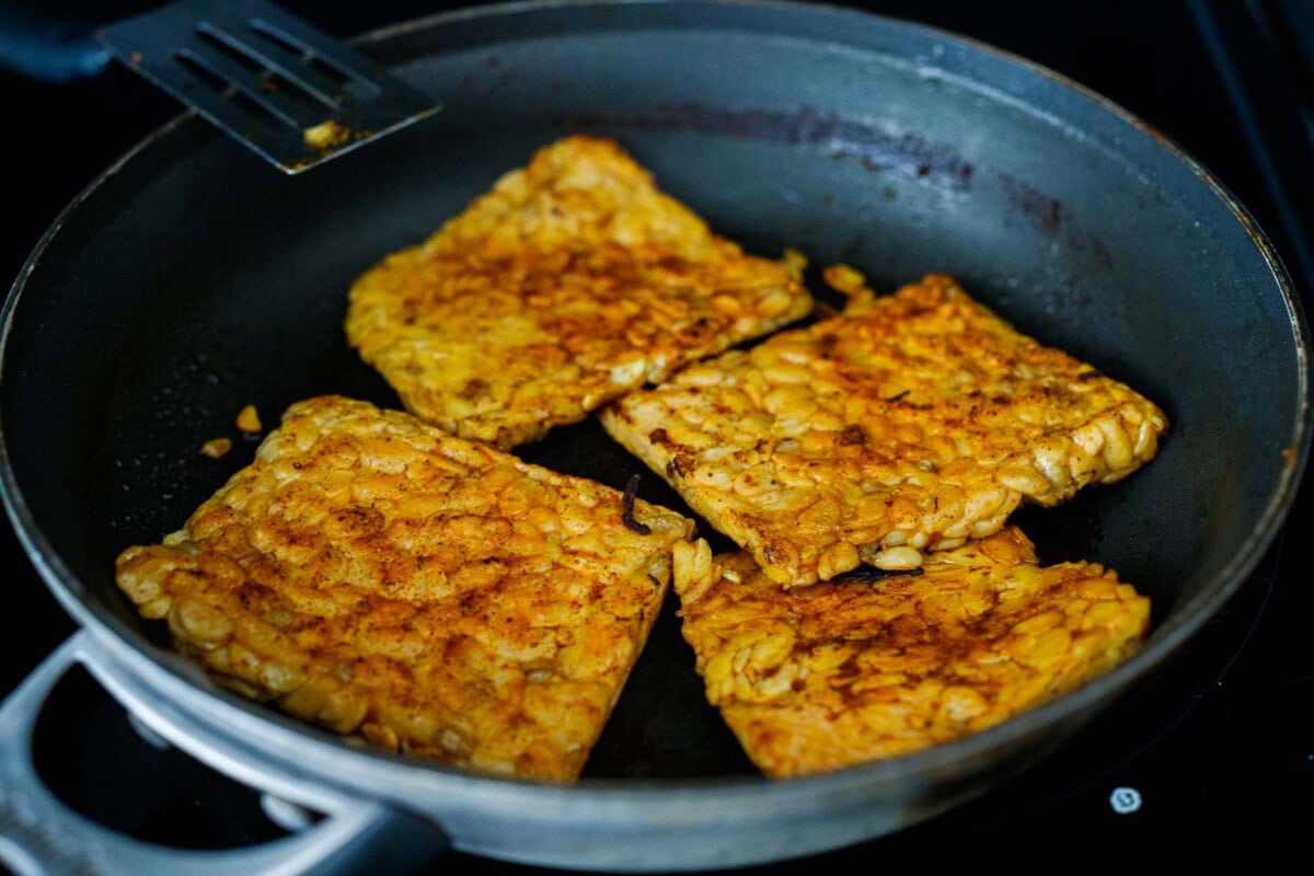 Step 3: Sear the tempeh. Drain it, wipe out the pan, and sear the tempeh slices over medium-high heat in a little olive oil until crispy and golden.