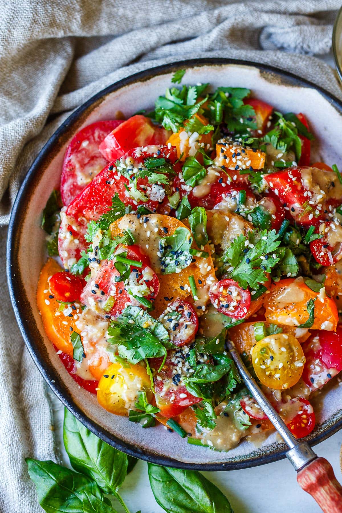 This summery Tomato Salad is a delicious way to savor ripe, juicy heirloom tomatoes! Sprinkled with fresh herbs and drizzled with a flavorful sesame ginger dressing. Vegan & GF adaptable.