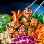This Crispy Sesame Tempeh bowl is easy, flavorful, and has the best texture! Create a healthy vegan bowl with brown rice and veggies and dinner is good to go!